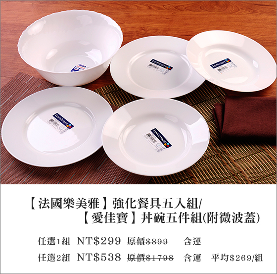 商品訊息簡述: 平均每組最低只要269元起(含運)即可享有五件組餐具系列1組/2組:(A)【法國樂美雅】強化餐具五入組/(B)【愛佳寶】丼碗五件組(附微波蓋)?