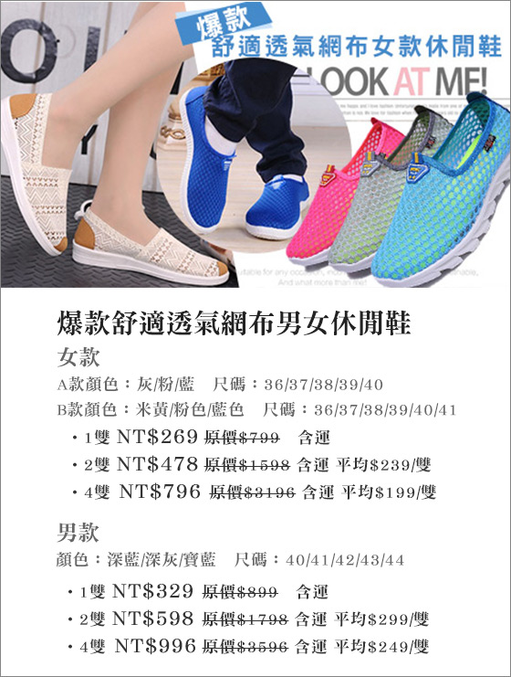 商品訊息簡述: 只要269元起(含運)即可享有原價最高3,596元爆款舒適透氣網布男女休閒鞋1雙/2雙/4雙:(A)女款,A、B款顏色、尺碼任選/(B)男款,顏色、尺碼任選?